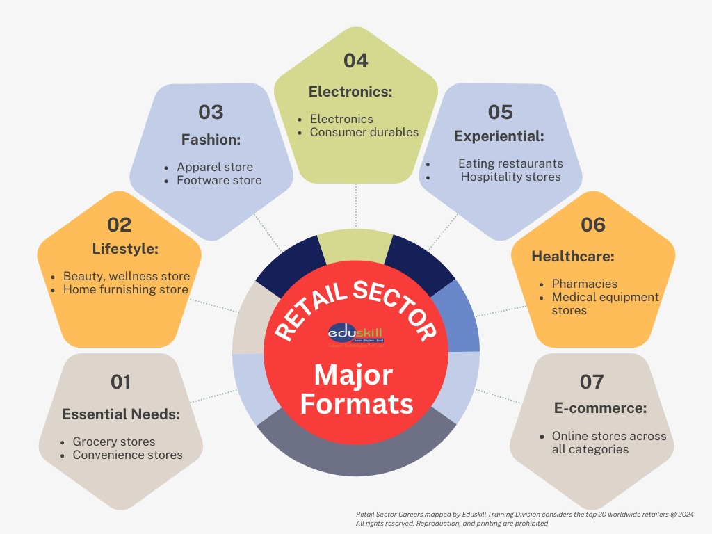 Groceries: From hypermarkets to neighborhood stores, retail professionals keep shelves stocked and ensure a smooth shopping experience for grocery shoppers. Online Stores: E-commerce is booming, creating a demand for specialists in online store management, marketing, and logistics to navigate the digital marketplace. International Toys: Bring smiles to children's faces! This segment requires professionals who understand international sourcing and cater to the evolving toy market. Eating Restaurants: The food and beverage industry thrives on passionate individuals who can manage restaurants, cafes, and quick service operations. Beauty & Wellness: From cosmetics to personal care products, this segment offers opportunities for those with an understanding of beauty trends and customer preferences.Electronics & Consumer Durables: Tech-savvy individuals can find their niche in managing electronics stores or overseeing the supply chain for these high-demand products.Home Furnishing: Help people create their dream homes! Retail professionals can manage furniture stores or specialize in visual merchandising to create inspiring displays.Convenience Stores: Cater to the needs of busy consumers by managing convenience stores that offer a variety of everyday essentials.Hospitality: Luxury hotels, budget accommodations, and everything in between - the hospitality sector offers retail opportunities for those with a passion for service.Healthcare: Pharmacies and medical equipment stores require retail professionals who can manage inventory and ensure customers have access to the healthcare products they need.